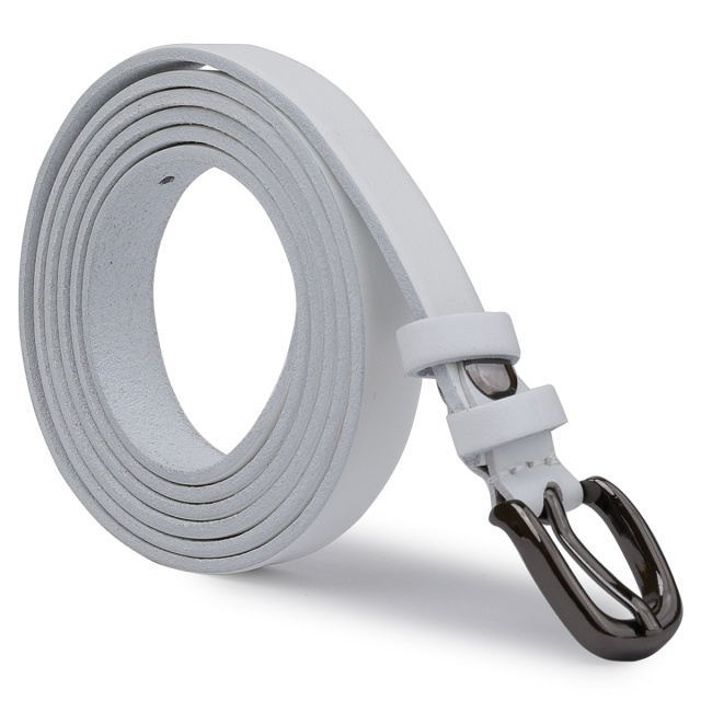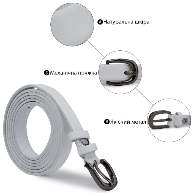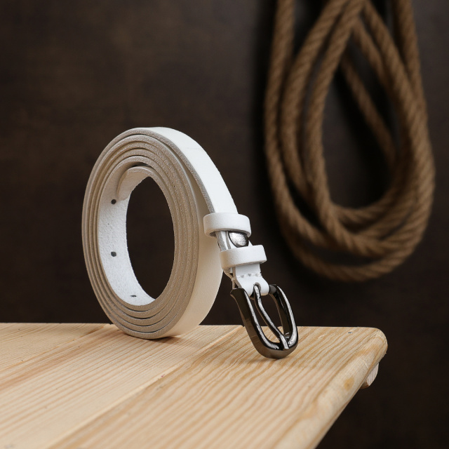 Тонкий легкий ремінець для жінок в ніжному білому кольорі. Виготовлений з високоміцної і зносостійкої натуральної шкіри, завдяки якій виріб буде радувати Вас дуже довго. Пряжка в даній моделі - класична, фактура - гладка і приємна на дотик. Такий ремінь стане практичним і дуже корисним подарунком.