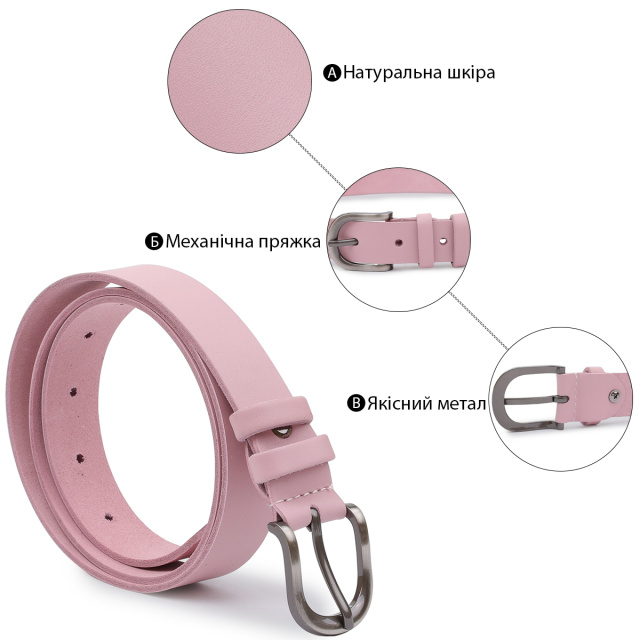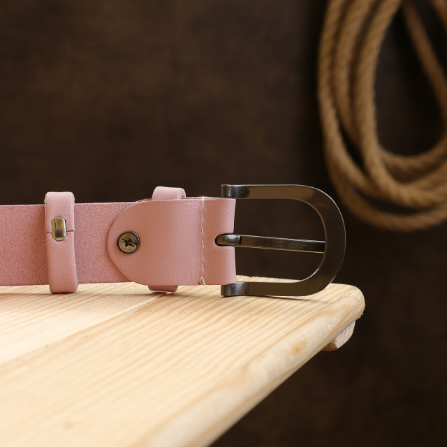 Гарний сучасний ремінь, якість якого видно неозброєним оком. Виконаний з натуральної зносостійкої шкіри з приємною на дотик гладкою фактурою. Колір виробу - світло-рожевий, виглядає дуже стильно і незвично. Такий ремінь можна піднести як подарунок на будь-яке свято.