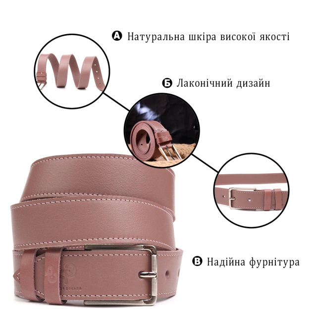 Ніжний жіночий ремінь із високоякісної італійської шкіри. Виріб прошито по краях рівним рядком рожевого кольору, що надає йому стильного та вишуканого вигляду. Аксесуар буде відмінно поєднуватись, як із брюками, так і з джинсами. Пряжка виконана з якісної фурнітури, із закругленими краями, дуже акуратна та стильна. Колір пряжки: срібло. Тиснення логотипу бренду додає виробу стилю, а також є запорукою якості та оригінальності продукції. Шкіряний ремінь буде завжди актуальним подарунком для себе, подруги чи колеги.