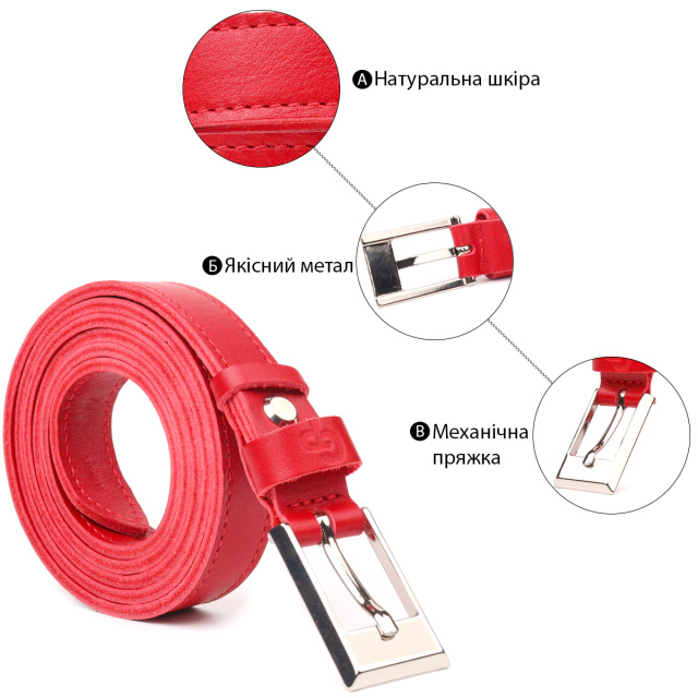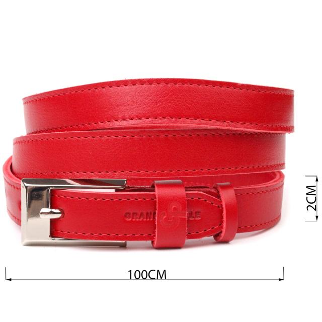 Яскравий жіночий ремінь із високоякісної італійської шкіри. Виріб прошито по краях рівним рядком червоного кольору, що надає йому стильного та вишуканого вигляду. Аксесуар буде відмінно поєднуватись, як зі штанами, так і з сукнею, блузкою або тунікою. Пряжка виконана з якісної фурнітури, з гострими краями, дуже акуратна та стильна. Колір пряжки: срібло. Тиснення логотипу бренду додає виробу стилю, а також є запорукою якості та оригінальності продукції. Шкіряний ремінь буде завжди актуальним подарунком для себе, подруги чи колеги.