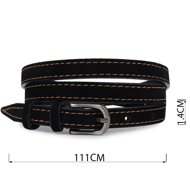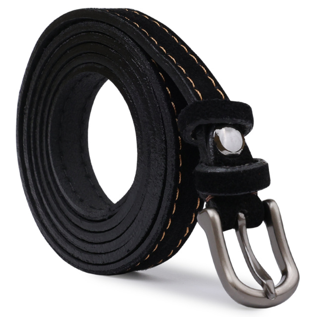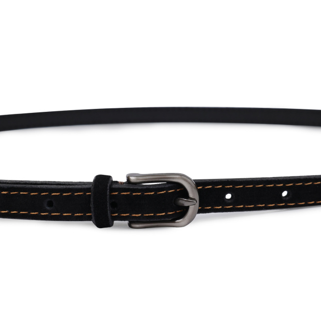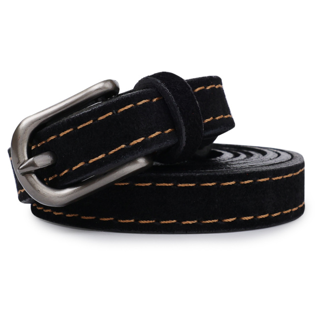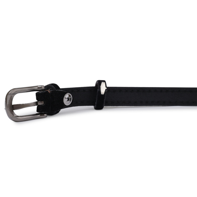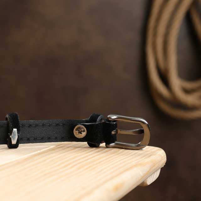 Чудовий жіночий ремінь із замші в універсальному чорному кольорі, що дозволяє носити його під будь-який стиль одягу і взуття. Матеріал виготовлення - натуральна високоякісна шкіра з високими показниками міцності. Пряжка невеликого розміру і має лаконічний простий дизайн, фактура виробу дуже приємна на дотик