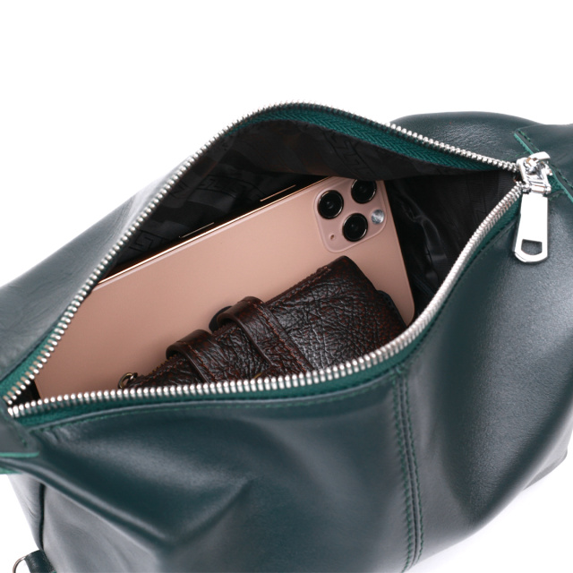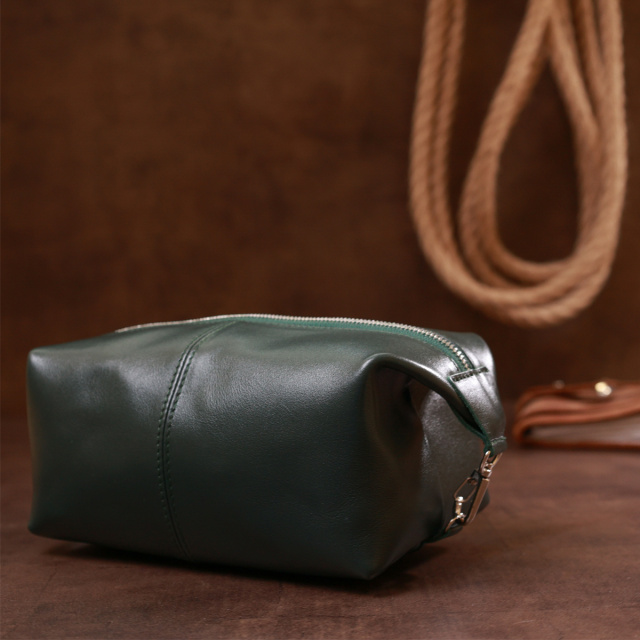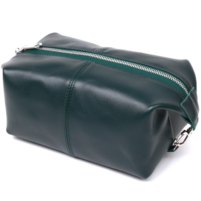 Універсальна косметичка для зберігання цінних речей, документів, косметики, що є особливо актуальним під час подорожей. Виконана вона з натуральної шкіри високого класу та покращеної зносостійкості. Виріб має красивий темно-зелений колір і гладку приємну на дотик фактуру. Таку косметичку можна сміливо дарувати на будь-яке свято дорогій людині.