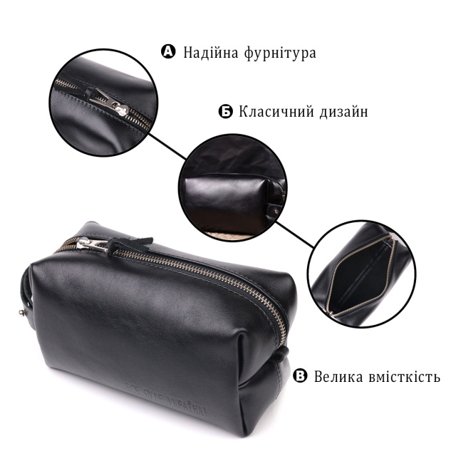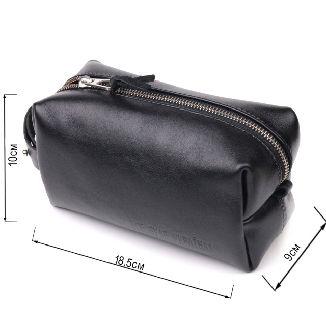 Відмінний чоловічий несесер, середнього розміру у гарній гладкій шкірі, з патріотичним тисненням на лицьовій стороні “Все буде Україна”. Має просторе відділення, в яке помістяться всі необхідні речі. Надійна фурнітура представлена у срібному кольорі. Для зручного перенесення аксесуарів є спеціальна ручка на бічній стінці. Запакована ця косметичка в красиву сумку фетрову. Вироби зі шкіри – чудова ідея подарунка на будь-які свята.
