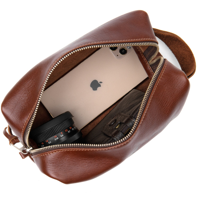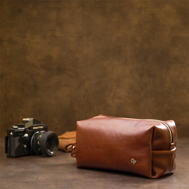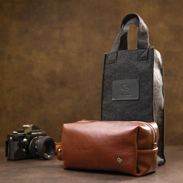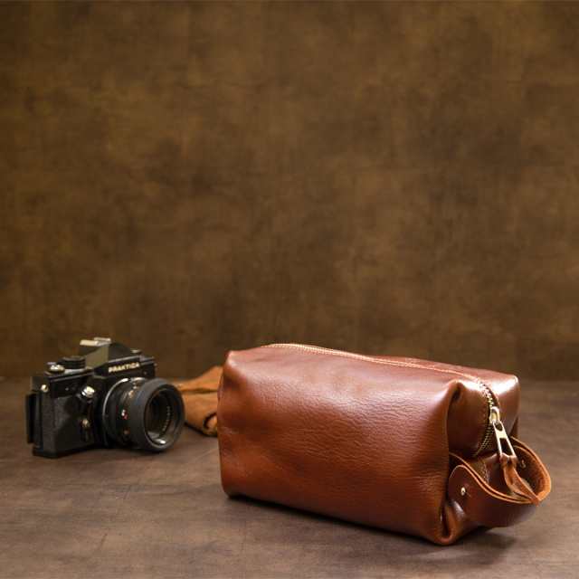Добротна чоловіча косметичка з високоякісної натуральної шкіри в гарному насиченому коричневому кольорі. Має компактні розміри, але при цьому дуже містка і функціональна. Така косметичка може стати незамінним аксесуаром в поїздці або просто в повсякденному використанні. Також вона може стати незабутнім подарунком для близької людини.