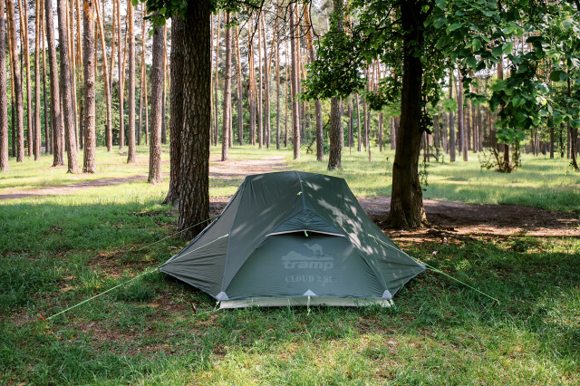 Ультралегкий тримісний туристичний намет хабової конструкції Tramp Cloud 3 Si з силіконізованого Rip-Stop нейлона. Вільностояча хабова конструкція каркасу забезпечує дуже швидке, просте, інтуїтивно зрозуміле встановлення, більший, в порівнянні з наметами інших конструкцій, житловий об'єм спального відсіку та підвищену вітростійкість. Хабова конструкція каркасу намету (HUB) – це коли всі дуги з'єднані одним конектором (хабом), який по'єднує весь каркас намету в одне ціле. Дуги не зміщуються одна відносно іншої і намет гарно тримає форму, його практично неможливо встановити криво чи з перекосом. Додаткова консольна коротка тамбурна дуга збільшує об'єм та висоту тамбурів, а також надає намету більш вітрообтічну форму. Внутрішній намет практично повністю виконаний з сітки, завдяки чому весь об'єм чудово вентилюється. В ньому практично не накопичується конденсат, і вам буде комфортно навіть в жарку літню ніч. Намет пошитий з міцного, підсиленого Rip-Stop плетінням та просоченого силіконом, нейлона з високим рівнем водонепроникності. Завдяки світло сірому кольору тент буде значно менше вигорати на сонці, і довше прослужить, якщо ви часто мандруєте літом чи в спекотних країнах.