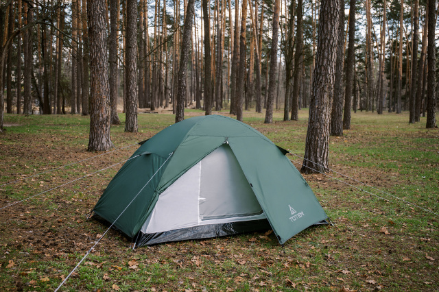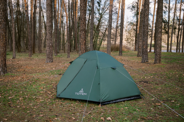 Універсальний двомісний легкий літній намет Totem Trek 2 з одним входом і невеликим тамбуром для нескладних коротких походів та відпочинку на природі з травня по вересень.