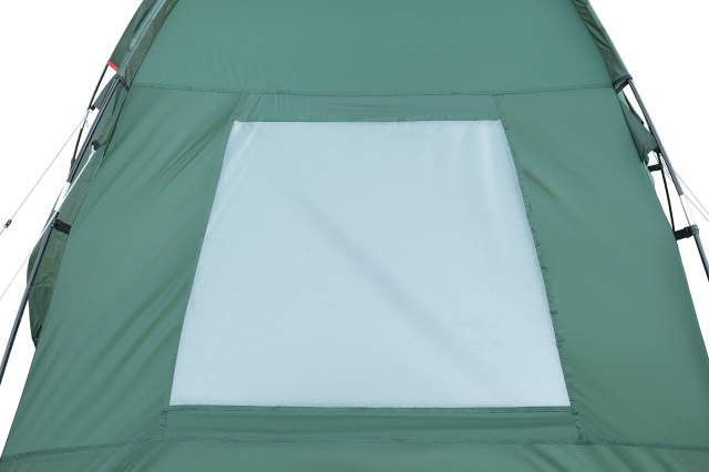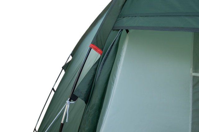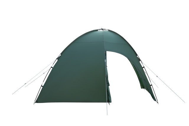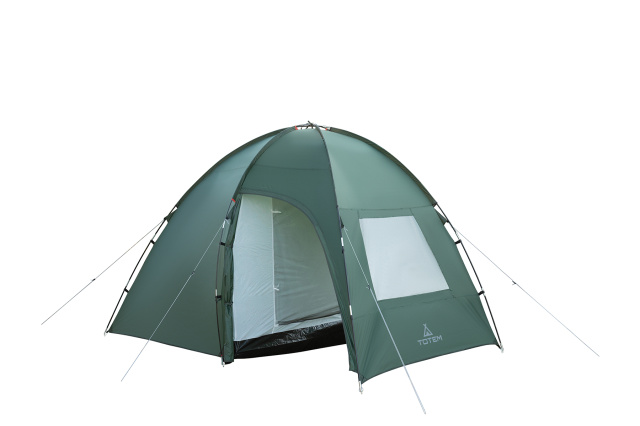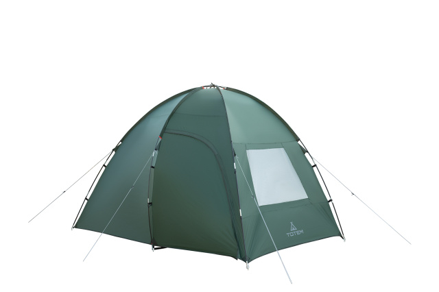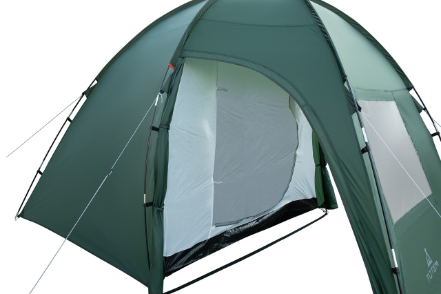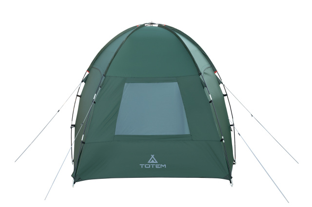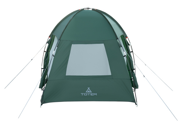 Однокімнатний тримісний кемпінговий намет Totem Apache 3. Просторий високий тамбур з 2 входами і оглядовим вікном в торцевій стінці. Зовнішні дуги дозволяють комфортно встановлювати і складати намет під дощем, а також використовувати його як окремий павільйон, кают-компанію чи кухню.
