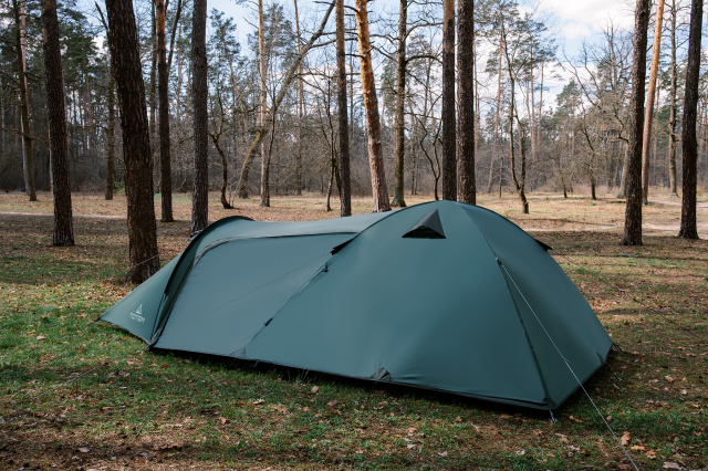 Універсальний тримісний намет Totem CARRIAGE 3. Тридугова модель конструкції напівсфера з просторим тамбуром збільшеної довжини і одним входом.