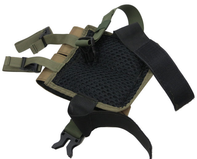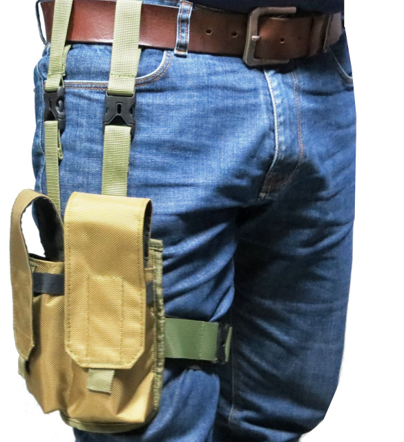 Підсумок кріпиться двома петлями до ременя на штанах (є можливість швидко скидання підсумка завдяки спеціальним фастексам), один еластичний ремінець-стійка на липучці кріпиться до ноги, другий додатковий ремінець на фастексі також кріпиться до ноги поверх першого ремінця для надійної фіксації.